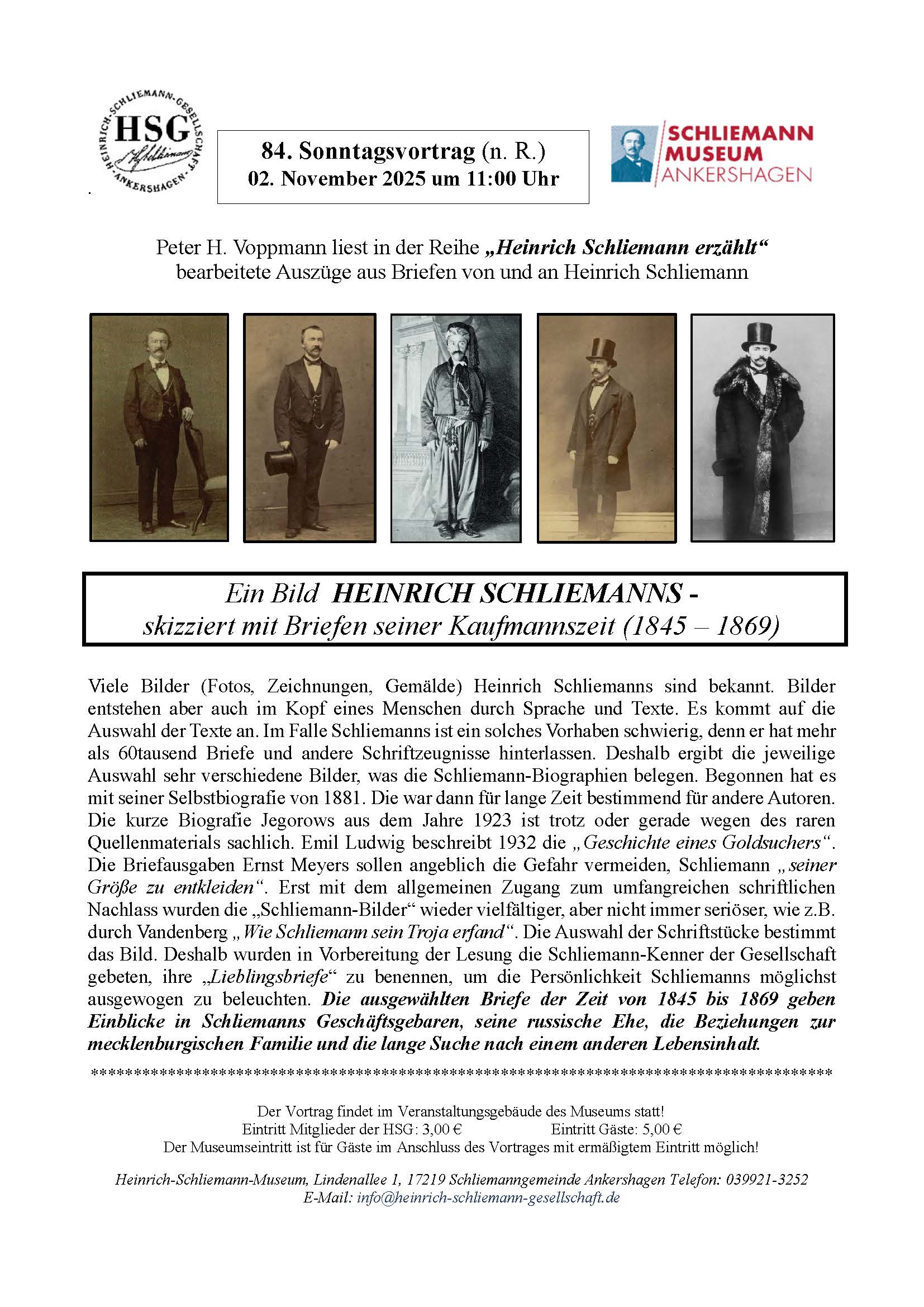 Von Mai 2003 bis August 2017 hielt der ehemalige Leiter des Heinrich-Schliemann-Museums Ankershagen, Dr. Reinhard Witte, an jedem ersten Sonntag im Monat jeweils 11:00 Uhr einen speziellen Vortrag zu Heinrich Schliemann bzw. zu den Kulturen, die dieser mit als erster erforschte. Aber auch andere Themen wurden von ihm in 168 Sonntagsvorträgen behandelt. Nach seinem Ausscheiden aus dem Amt beschloss der Vorstand der internationalen Heinrich-Schliemann-Gesellschaft, diese Tradition in seiner Regie in einer neuen Reihe mit wechselnden Referentinnen und Referenten fortzuführen. Wir freuen uns auf Ihren Besuch!
