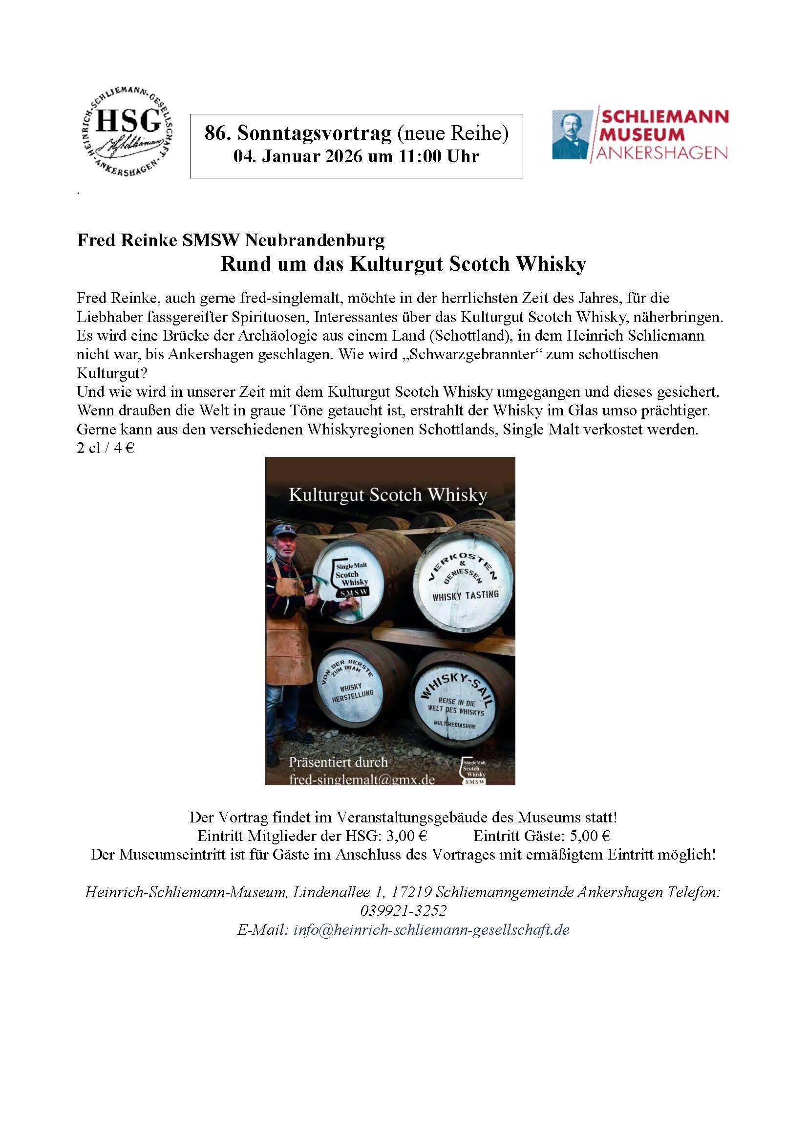 Von Mai 2003 bis August 2017 hielt der ehemalige Leiter des Heinrich-Schliemann-Museums Ankershagen, Dr. Reinhard Witte, an jedem ersten Sonntag im Monat jeweils 11:00 Uhr einen speziellen Vortrag zu Heinrich Schliemann bzw. zu den Kulturen, die dieser mit als erster erforschte. Aber auch andere Themen wurden von ihm in 168 Sonntagsvorträgen behandelt. Nach seinem Ausscheiden aus dem Amt beschloss der Vorstand der internationalen Heinrich-Schliemann-Gesellschaft, diese Tradition in seiner Regie in einer neuen Reihe mit wechselnden Referentinnen und Referenten fortzuführen. Wir freuen uns auf Ihren Besuch!